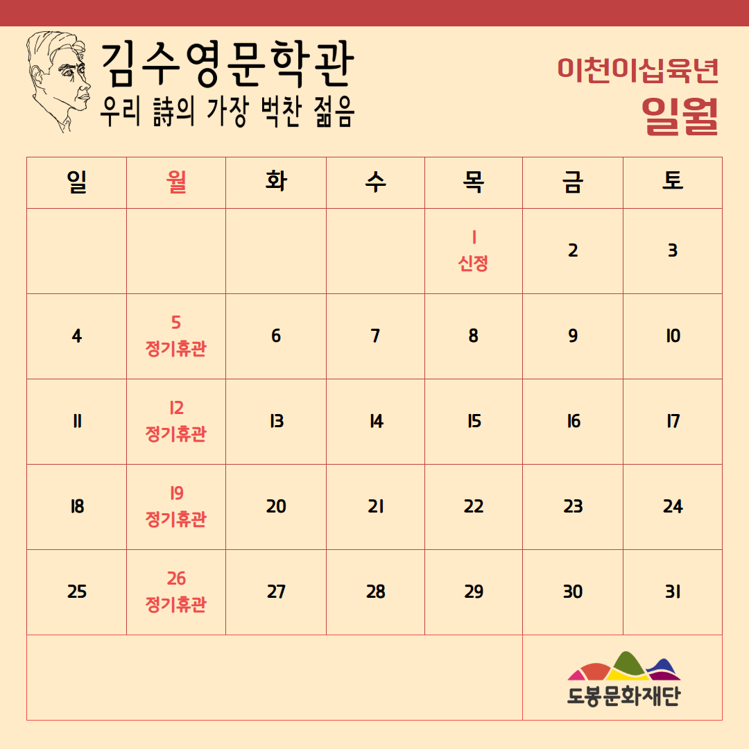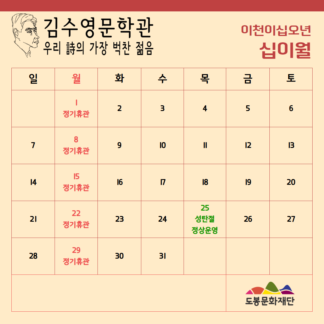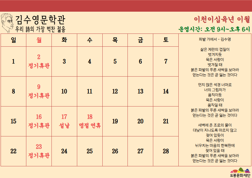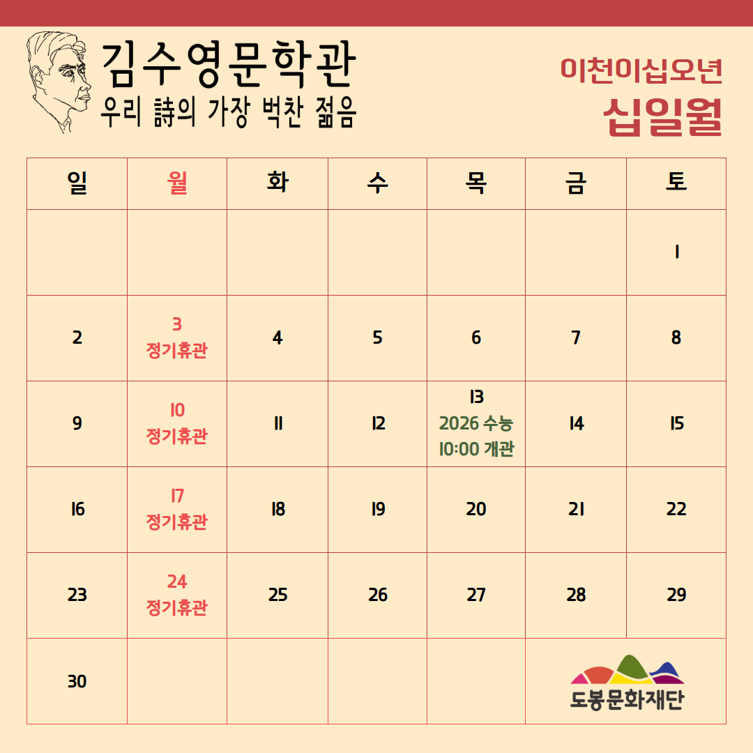 김수영문학관 김수영문학관 소개 시설 소개 관람 안내 오시는 길 시인 김수영과 작품세계 시인 김수영 회고와 평론 김수영문학관 소식 공지사항 미디어 소식 시작(詩作) 갤러리 포토 갤러리 대관신청 관람 안내 오시는 길 공지사항 관람 안내 휴관일 매주 월요일 (월요일이 공휴일인 경우 그 다음날) 1월1일, 설날 및 추석 연휴 관람 시간 오전 9시 ~ 오후 6시 오시는 길 대중교통 이용 시 버스 130번, 1144번, 노원15번 정의공주 묘 하차 지하철 4호선 쌍문역 하차 2번 출구, 06번 마을버스 환승 김수영문학관 하차 공지사항 김수영문학관 소식을 보다 빠르고 정확하게확인할 수 있습니다. 하루 동안 보지않기 닫기
