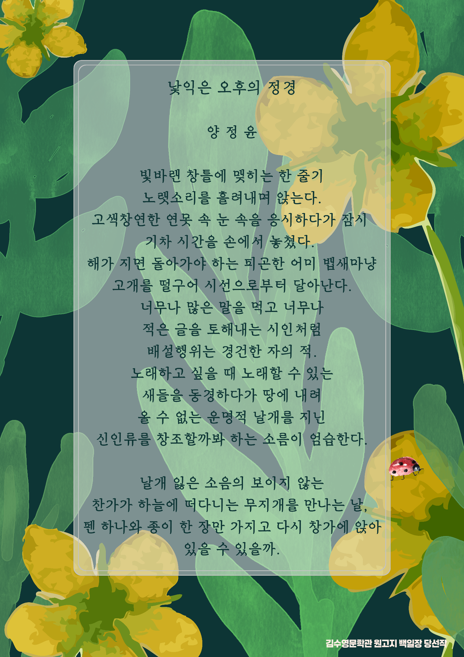 김수영문학관 김수영문학관 소개 시설 소개 관람 안내 오시는 길 시인 김수영과 작품세계 시인 김수영 회고와 평론 김수영문학관 소식 공지사항 미디어 소식 시작(詩作) 갤러리 포토 갤러리 대관신청 김수영문학관 소식 home 김수영문학관 소식 김수영문학관 소개 시인 김수영과 작품세계 김수영문학관 소식 대관신청 시작(詩作) 갤러리 공지사항 미디어 소식 시작(詩作) 갤러리 포토 갤러리 시작(詩作) 갤러리 미디어 소식 포토 갤러리 대관신청 시작(詩作) 갤러리 공지사항 1:1문의 리뷰 김수영문학관 원고지 백일장 1차 당선작 [낯익은 오후의 정경 - 양정윤] 관리자 / 2025-09-10 2025 김수영문학관 원고지 백일장 1차 당선작 낯익은 오후의 정경 - 양정윤 목록