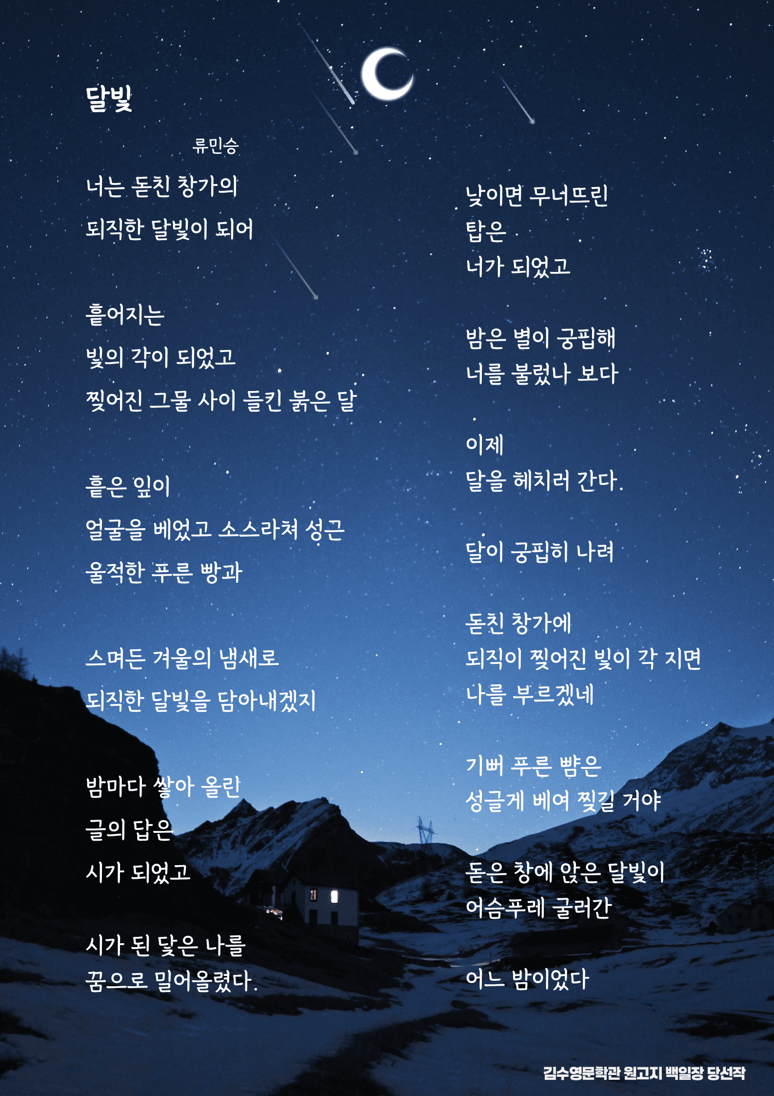 김수영문학관 김수영문학관 소개 시설 소개 관람 안내 오시는 길 시인 김수영과 작품세계 시인 김수영 회고와 평론 김수영문학관 소식 공지사항 미디어 소식 시작(詩作) 갤러리 포토 갤러리 대관신청 김수영문학관 소식 home 김수영문학관 소식 김수영문학관 소개 시인 김수영과 작품세계 김수영문학관 소식 대관신청 시작(詩作) 갤러리 공지사항 미디어 소식 시작(詩作) 갤러리 포토 갤러리 시작(詩作) 갤러리 미디어 소식 포토 갤러리 대관신청 시작(詩作) 갤러리 공지사항 1:1문의 리뷰 2025 김수영문학관 원고지 백일장 3차 당선작 [달빛 - 류민승] 관리자 / 2026-01-07 목록