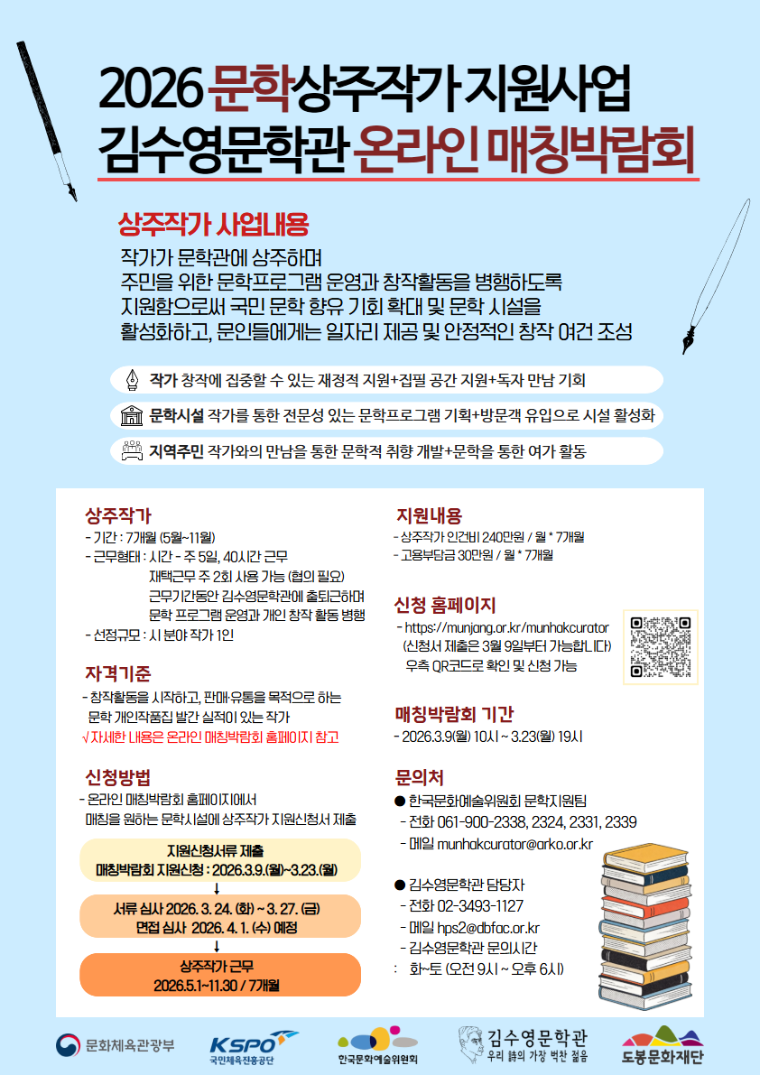 한국문화예술위원회가 주관하는 2026년 문학상주작가 지원사업에 김수영문학관이 선정됐습니다.